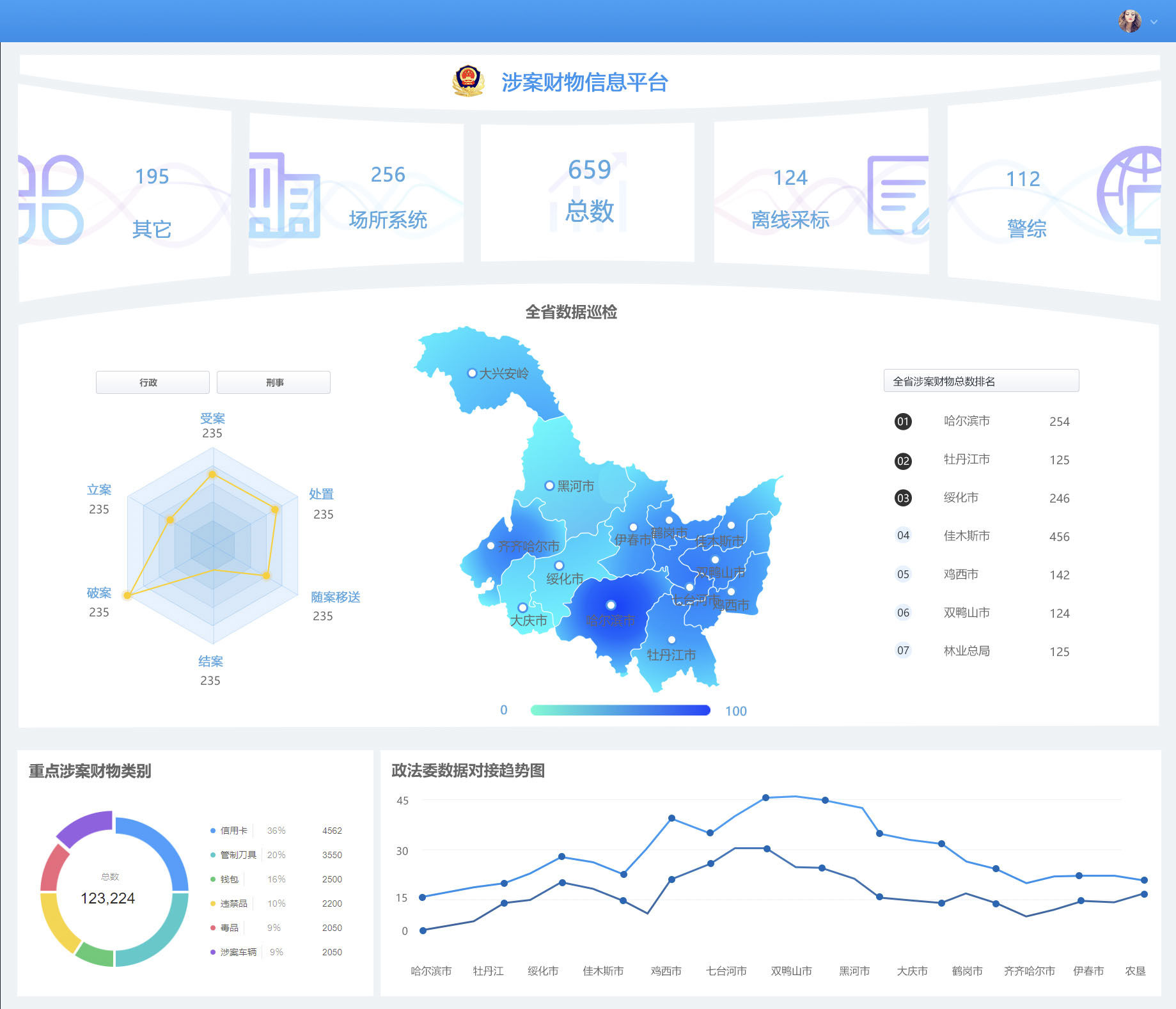 黑龍江省涉案財(cái)物管理系統(tǒng),是在中央政法委、黑龍江省委政法委、省公安廳按照《涉案財(cái)物跨部門集中管理信息平臺(tái)工作方案》建設(shè)的背景下研發(fā)應(yīng)用。實(shí)現(xiàn)全省各地市局涉案財(cái)物數(shù)據(jù)的匯聚和業(yè)務(wù)監(jiān)管,完成涉案財(cái)物跨公檢法數(shù)據(jù)互聯(lián)互通,全流程閉環(huán)管理。
