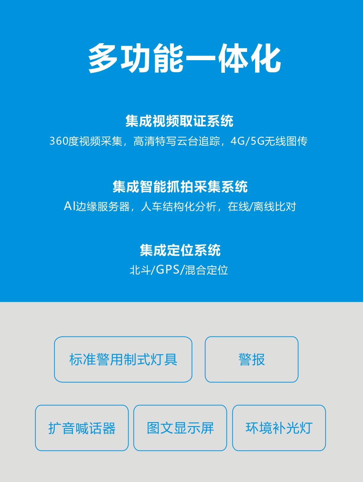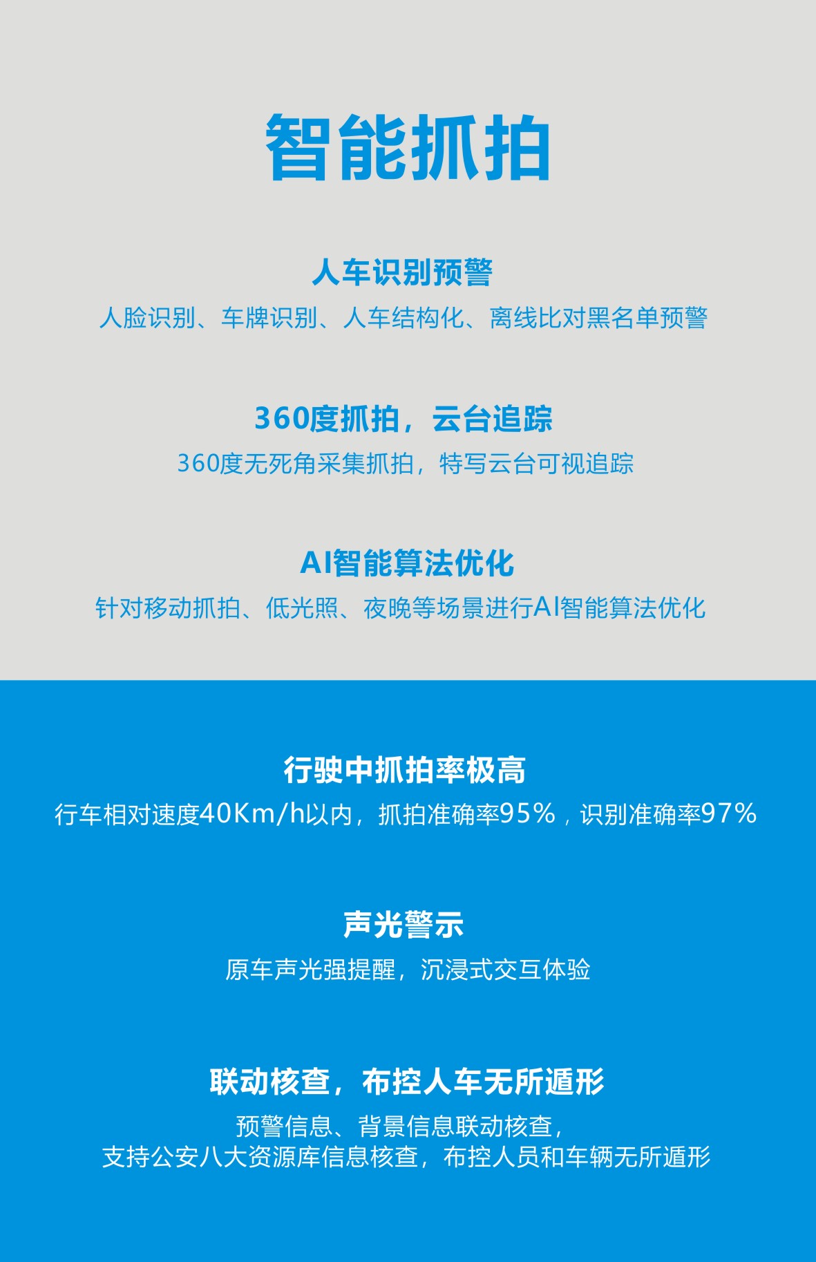 本次展會上,海鄰科創(chuàng)新推出的5G智慧警車巡控系統(tǒng)居于國內領先水平,集多功能于一體,通過5G圖文傳輸,具備7路高清視頻采集、人臉識別、車牌識別、人車結構化、離線比對黑名單預警、360度無死角采集抓拍、特寫云臺可視追蹤、AI智能算法優(yōu)化、原車聲光強提醒、沉浸式交互體驗、抓拍率極高等功能,人車聯動核查,布控人員和車輛無所遁形。車載抓拍后臺比對實現車載、警務通預警,一點預警多端響應,支持車車聯動、人車協(xié)同、信息共享、動態(tài)封控,進行精準打擊。憑借創(chuàng)新高科技多功能、炫酷高顏值的優(yōu)勢,大放警彩,驚艷全場。
