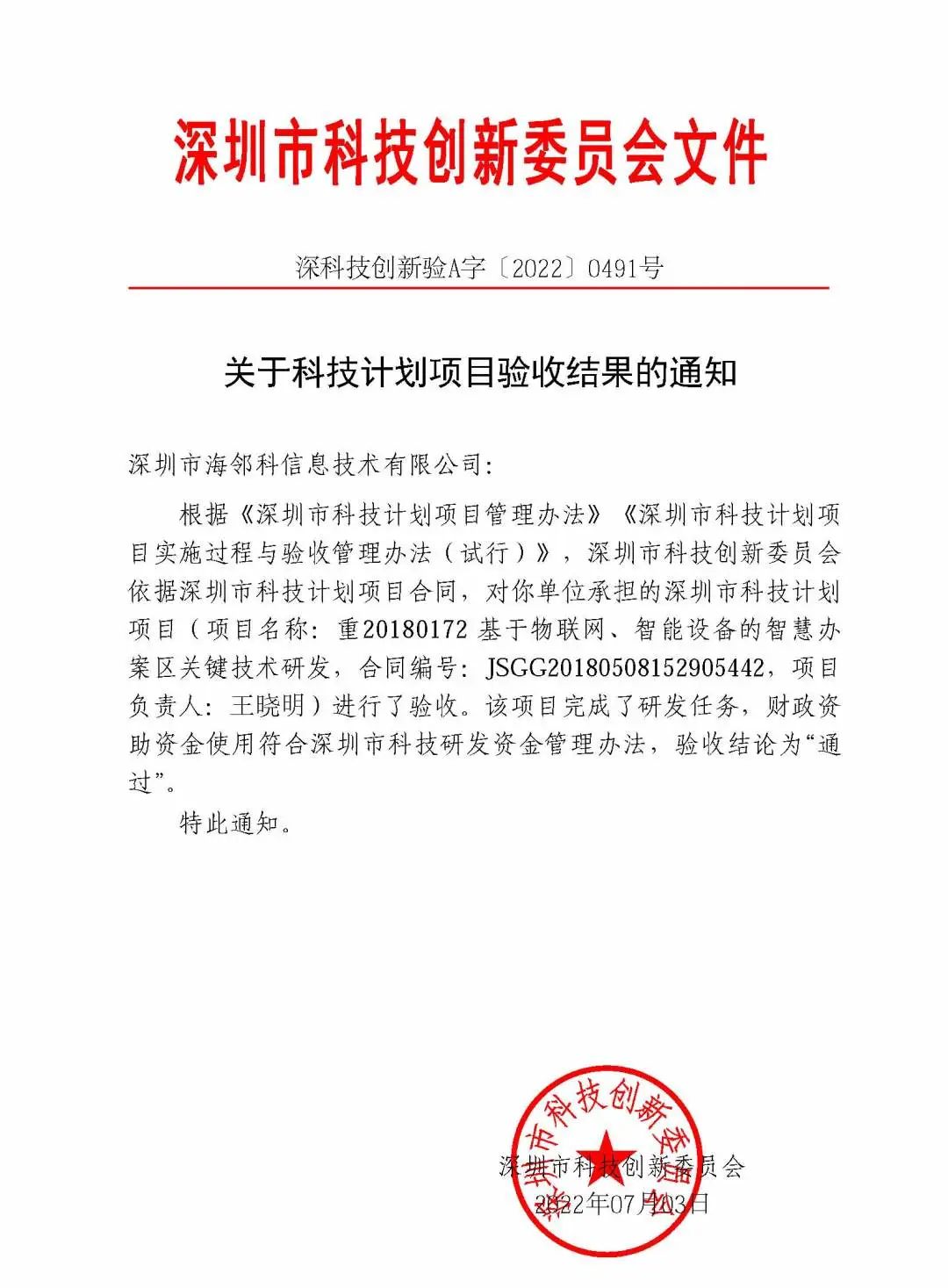 創(chuàng)新不止步,攻堅(jiān)不停歇。近日,海鄰科關(guān)鍵技術(shù)研發(fā)項(xiàng)目再獲突破,“基于物聯(lián)網(wǎng)、智能設(shè)備的智慧辦案區(qū)關(guān)鍵技術(shù)研發(fā)”項(xiàng)目通過深圳市科技創(chuàng)新委員會(huì)2022年第3批科技計(jì)劃驗(yàn)收。